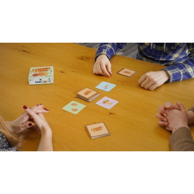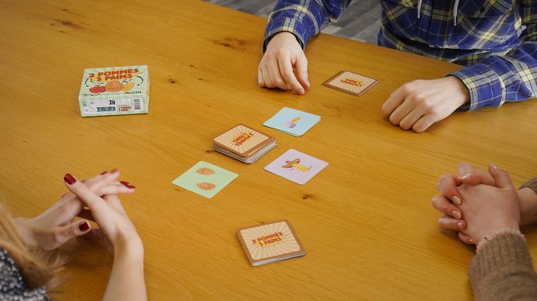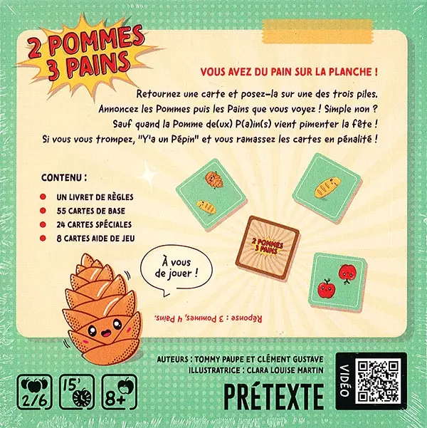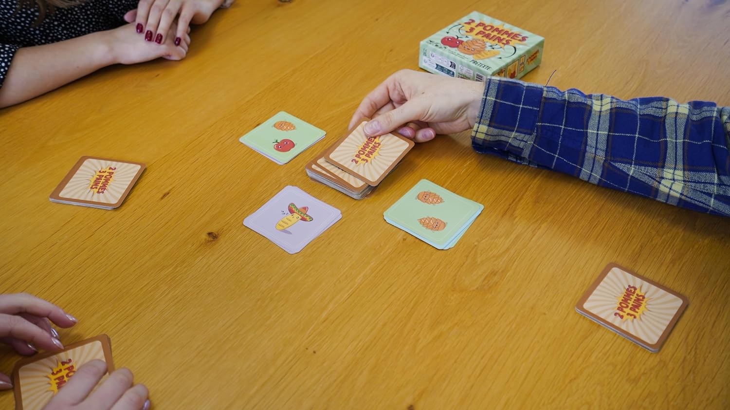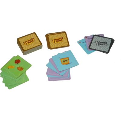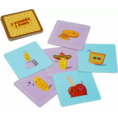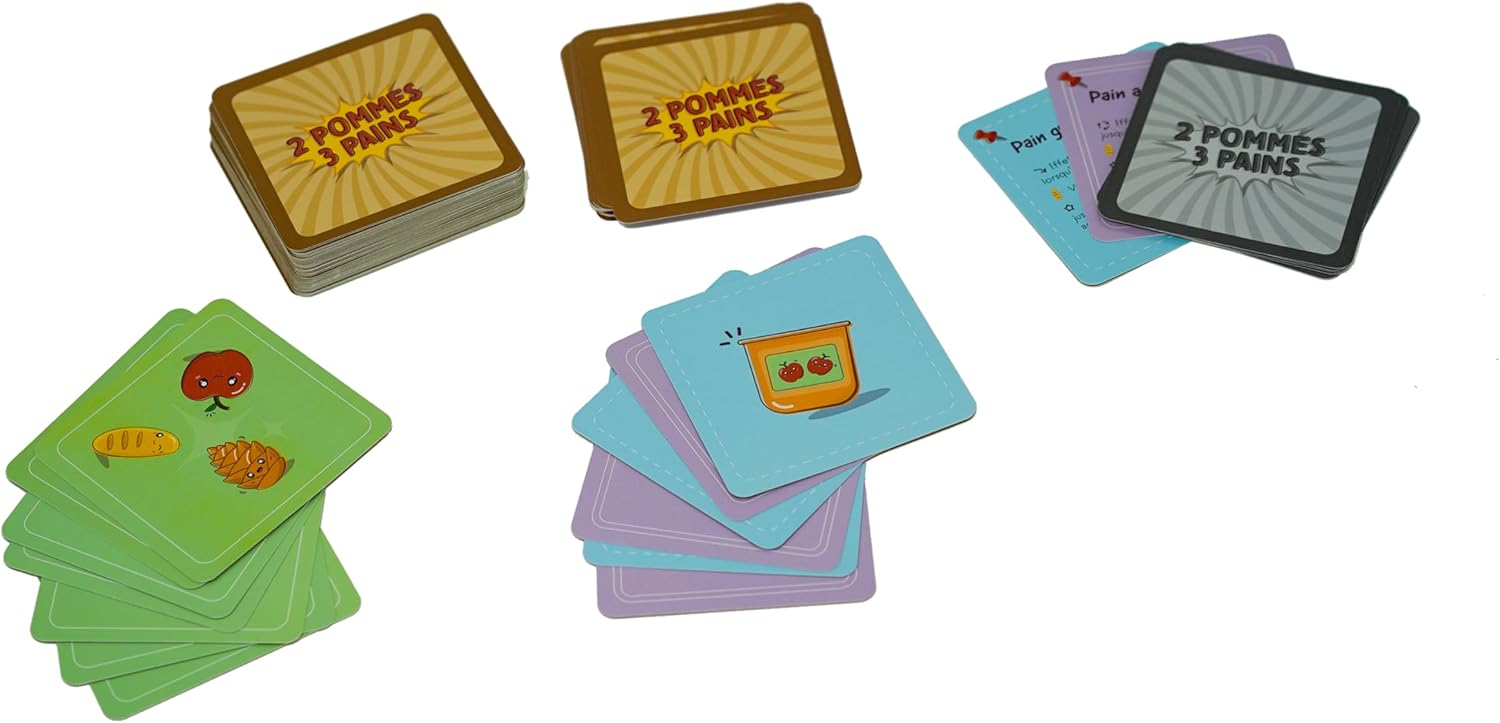 2 Pommes 3 Pains, c’est un petit jeu d’annonce aussi simple en apparence que fourbe en pratique ! À chaque tour, une carte est révélée et il faut annoncer le nombre exact de pommes et de pains présents sur la table. Facile ? Pas tant que ça ! La mémoire flanche, le stress monte… et la moindre hésitation peut coûter cher : toutes les cartes en pénalité. Et gare aux cartes spéciales et aux pommes de pain… elles ajoutent du piquant à la partie, bouleversent vos calculs et déclenchent des éclats de rire. Ici, il n’y a qu’une règle pour gagner : avoir le moins de cartes possible. Un jeu rapide, malin et croustillant comme un croissant du matin !
