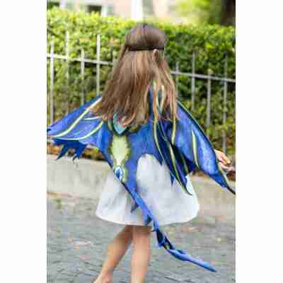Avec leurs grandes ailes bleu royal finement découpées et leurs délicats accents verts, ces ailes de dragon céleste invitent les enfants à entrer dans un monde de légendes et de créatures fantastiques. La matière souple accompagne chaque mouvement, donnant l’impression de véritables ailes prêtes à s’ouvrir dans le vent des aventures imaginaires. Une longue queue fluide complète la silhouette du dragon, tandis que le masque assorti vient parfaire la transformation.
