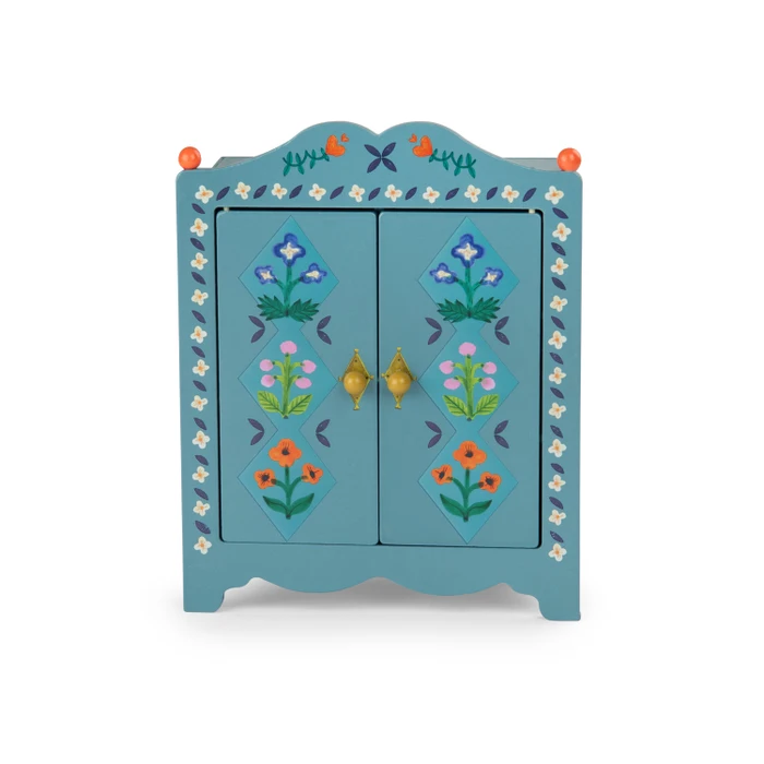 L’armoire des Minouchkas invite les enfants à explorer les rituels du quotidien à travers le jeu symbolique. Fabriquée en bois et décorée de motifs floraux doux et poétiques, elle s’ouvre sur un intérieur soigneusement pensé, avec une tringle et trois cintres pour suspendre les vêtements miniatures. Les portes à fermeture aimantée s’ouvrent et se referment facilement, encourageant la manipulation et la précision des gestes. Véritable élément de décor, cette armoire devient le théâtre de scènes tendres et familières, où l’on range, cherche, retrouve… et rêve.