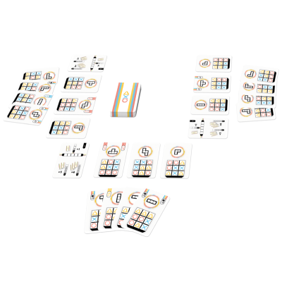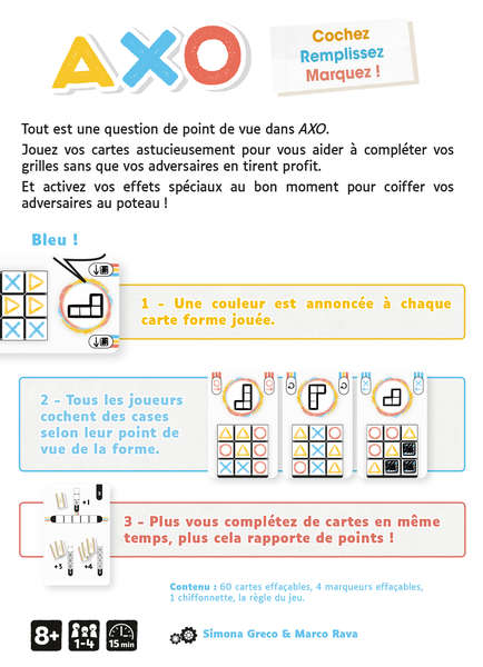 Dans Axo, chaque grille devient un terrain de stratégie et de malice. À chaque tour, une forme et une couleur s’invitent dans le jeu, et tous les joueurs doivent cocher les cases correspondantes sur leur propre grille. Mais attention : il ne suffit pas de remplir au hasard, il faut anticiper, optimiser et savoir utiliser ses cartes au bon moment pour compléter ses figures avant les autres.