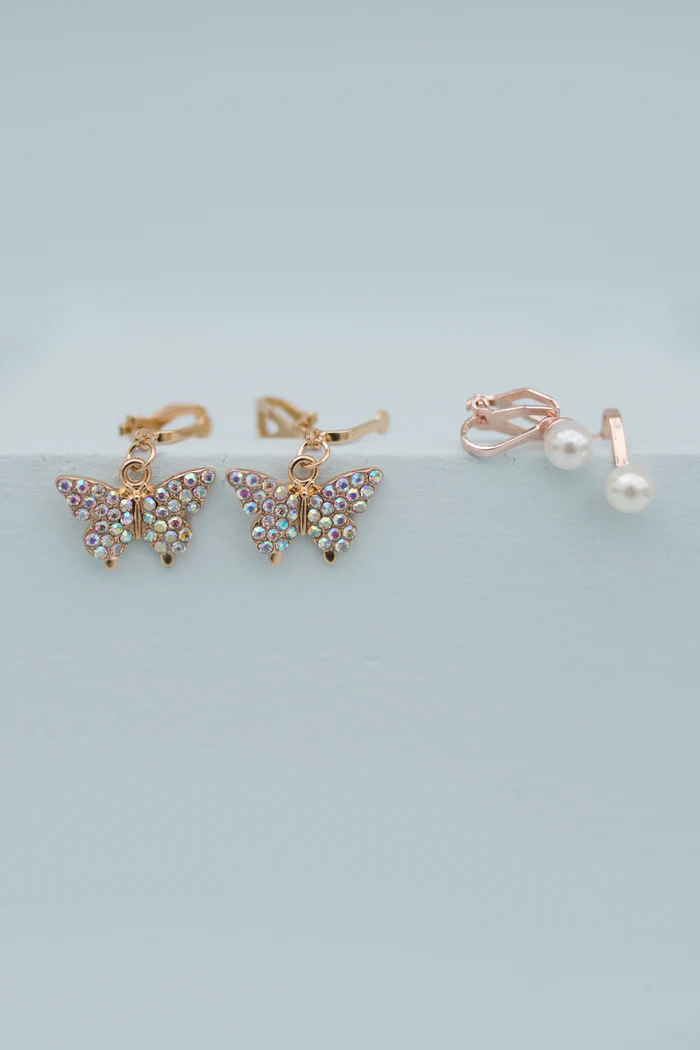 Les boucles d’oreilles clips Papillon & Perle Great Pretenders sont des bijoux fantaisie pour enfant, spécialement conçus pour les oreilles non percées. Chaque paire comprend un modèle papillon serti de strass irisés multicolores et un modèle perle nacrée classique. Le système à clips permet une fixation simple et confortable, adaptée aux jeunes enfants.