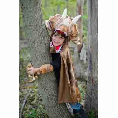 La cape de Tricératops Grandasaurus Great Pretenders référence 56807 est un déguisement dinosaure pour enfant composé de deux pièces : une cape avec capuche tête de tricératops et une paire de griffes assorties. Le tissu imprimé imite des écailles dans des nuances de marron, gris et orange, offrant un rendu réaliste et spectaculaire. La collerette est bordée de pointes métalliques dorées et la gueule est doublée de rouge pour accentuer l’effet visuel.