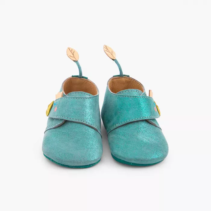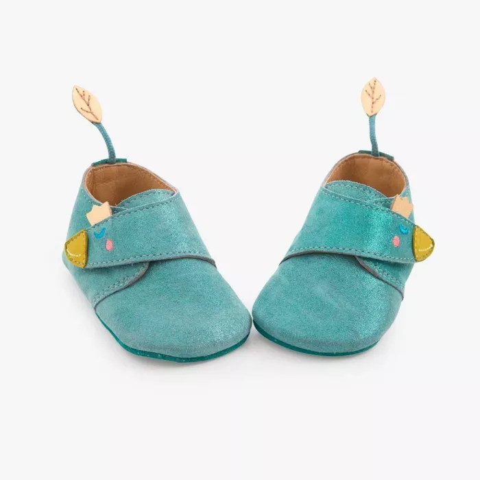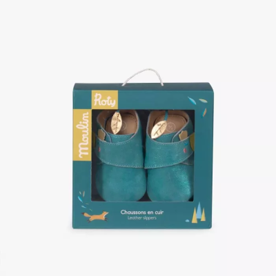 De petits pas poétiques s’annoncent avec ces adorables chaussons en cuir signés Moulin Roty. Habillés d’un bleu scintillant façon daim pailleté, ils révèlent une tête d’oie endormie coiffée d’une fine couronne dorée, comme un clin d’œil tendre à l’univers du Voyage d’Olga. Souples et confortables, ils accompagnent bébé dans ses premières explorations, du quatre pattes aux premiers pas, tout en douceur et en sécurité. Avec leur semelle en cuir velours antidérapante et leur semelle intérieure amovible à mousse, ces chaussons allient style, confort et protection, le tout dans un esprit raffiné.
