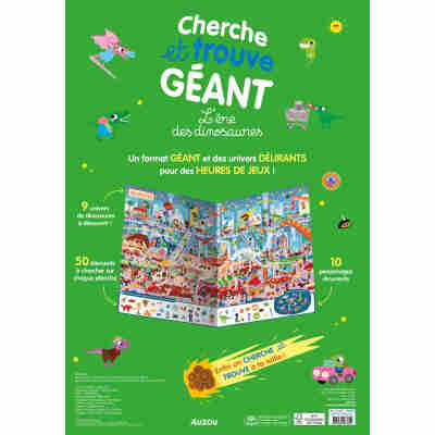 Cherche et trouve géant – L’ère des dinosaures est un livre-jeu grand format pensé pour les enfants curieux et attentifs. Chaque planche propose un univers illustré foisonnant de détails, mettant en scène des dinosaures dans des contextes variés et amusants. Les scènes sont riches, colorées et conçues pour inviter l’enfant à observer longuement afin de retrouver de nombreux éléments dissimulés. Le format géant permet une exploration confortable, idéale pour une utilisation au sol ou sur une grande surface.