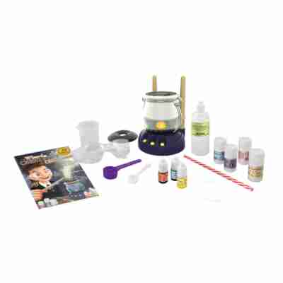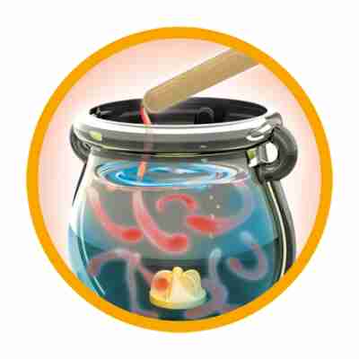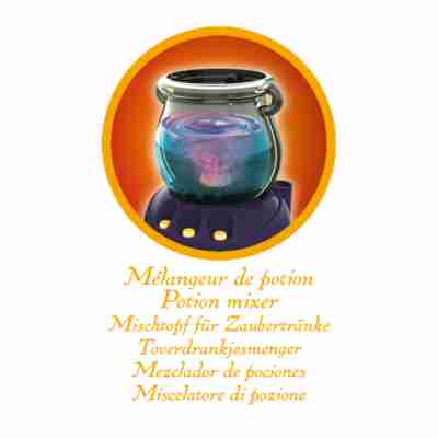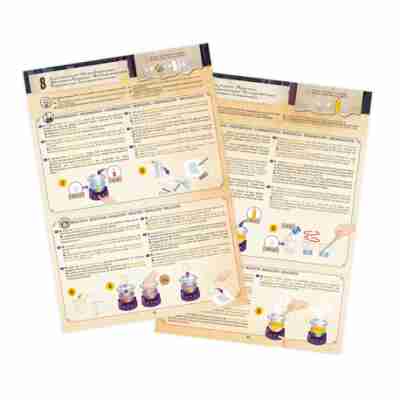 Inclus : 1 chaudron, 1 baguette pipette, 1 baguette cuillère, 1 gobelet 100 ml, 1 paille, 1 cuillère blanche (petite), 1 cuillère violette (grande), 1 paire de lunettes de protection, 1 ficelle, sel égyptien (Bicarbonate de soude) (40 g), jus d’algue (Alginate de sodium) (100 ml), rouge de phénol (1 g), bleu de tournesol (1 g), sang de griffon (Colorant rouge) (5 ml), liquide de lapis-lazuli (Colorant bleu) (5 ml), concentré de pissenlit (Colorant jaune) (5 ml), instructions en couleur.