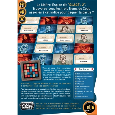 Dans ce jeu d’association d’idées, deux équipes s’affrontent pour retrouver leurs agents secrets cachés sous des noms de code mystérieux. Seuls les Maîtres-Espions connaissent leur identité, et devront guider leurs coéquipiers à l’aide d’un seul mot d’indice… mais attention aux pièges !