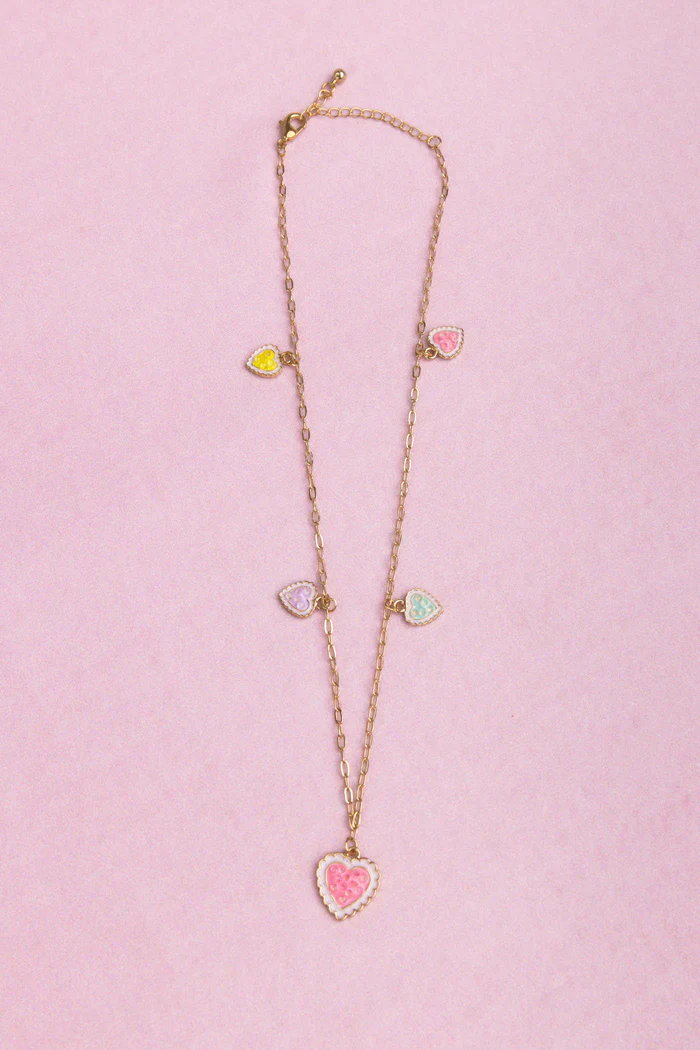 Le collier Chic Beloved Beauty Great Pretenders est un bijou fantaisie pour enfant et préadolescente composé d’une fine chaîne dorée agrémentée de petits pendentifs en forme de cœur aux couleurs pastel. Chaque cœur est délicatement encadré, apportant une finition élégante et soignée. Le pendentif principal, légèrement plus grand, attire subtilement la lumière et structure l’ensemble du bijou.