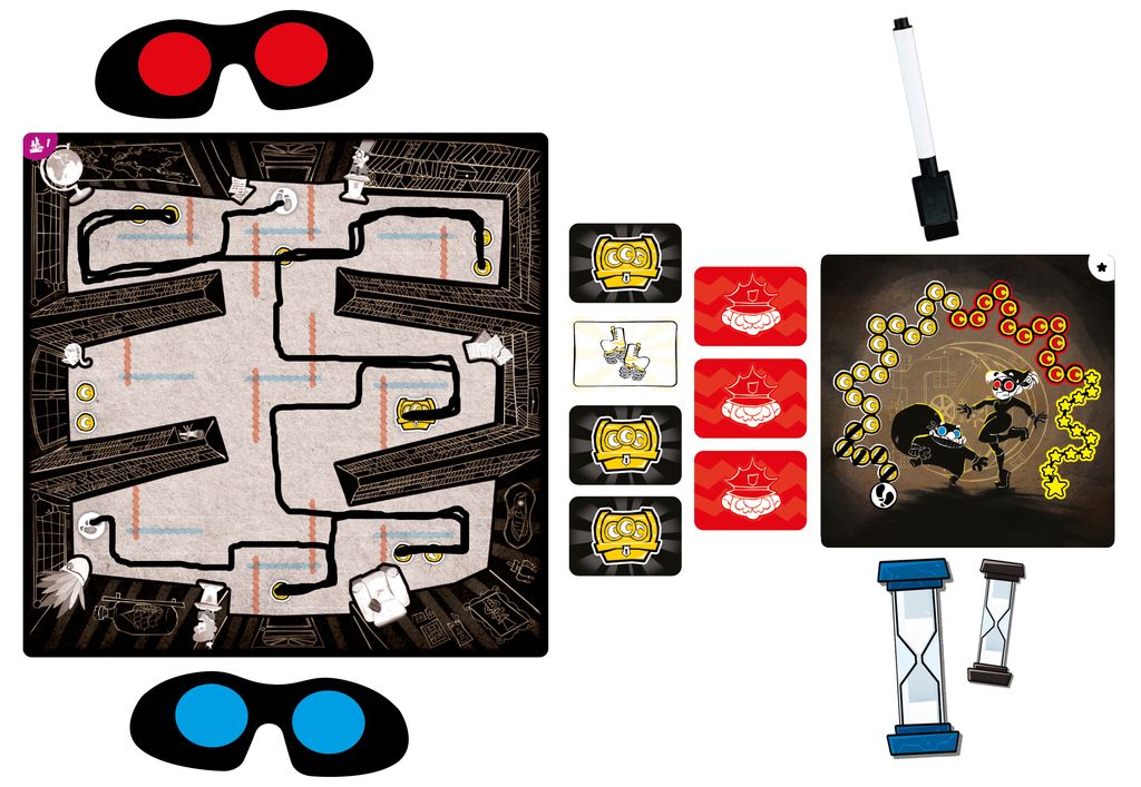 Chaque manche dure 2 minutes : l’un trace le parcours à l’aide d’un feutre, l’autre le guide pour éviter les lasers invisibles. Pièces ramassées = points gagnés, lasers touchés = points perdus. Après 4 manches, découvrez si vous avez accumulé assez de butin pour remplir votre repaire !