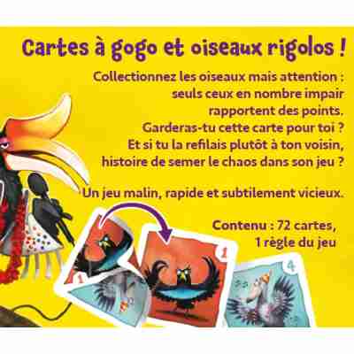 Dans Crazy Birds, collectionner des oiseaux n’a rien de reposant… bien au contraire ! Chaque carte que vous récupérez peut devenir un trésor ou une catastrophe, car ici, seuls les groupes en nombre impair rapportent des points. Alors forcément, chaque tour devient un délicieux casse-tête : garder cette carte pour renforcer votre collection ou la glisser malicieusement à un adversaire pour saboter ses plans ? Le jeu oscille entre stratégie, bluff et petits coups fourrés, le tout porté par des illustrations complètement déjantées qui donnent vie à une volière pas comme les autres.