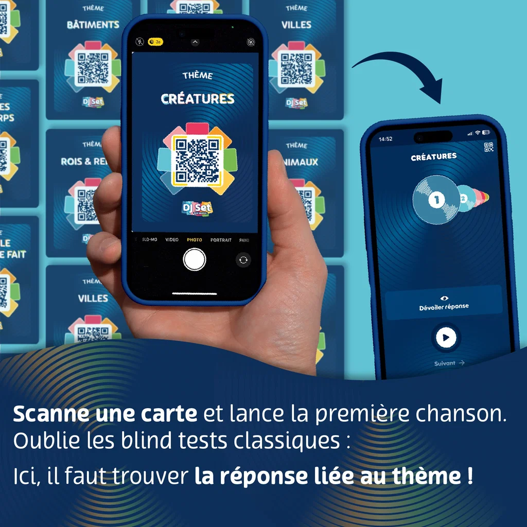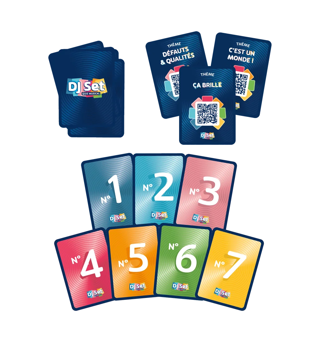 Avec DJ Set, oubliez les règles classiques du blind test : ici, pas besoin de connaître le titre ou l’artiste ! Chaque morceau cache en réalité un indice lié à un thème, et c’est à vous de faire le lien. Grâce à un simple scan de carte, la musique démarre… et les cerveaux s’activent ! Une couleur, un prénom, une ville, un métier… tout peut devenir une piste. En équipe, les joueurs échangent, débattent, s’exclament, et surtout s’amusent à interpréter la musique autrement.
