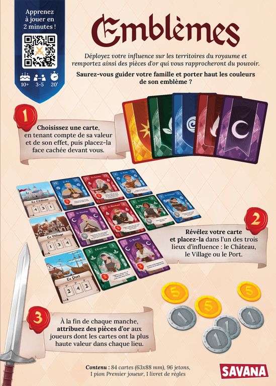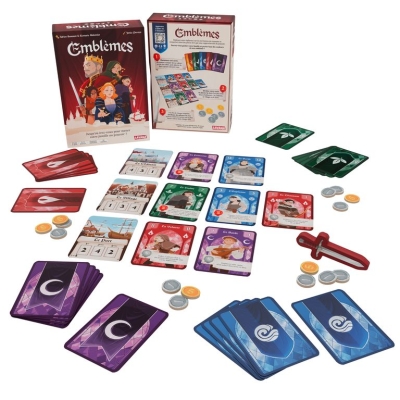 Le roi n’est plus, et le royaume tremble. Sans héritier, le trône devient le centre de toutes les intrigues, attisant l’ambition des grandes familles prêtes à tout pour imposer leurs couleurs. Dans Emblèmes, chaque joueur cherche à étendre son influence sur les trois lieux stratégiques du royaume : le Château, le Village et le Port. À chaque tour, vous choisissez une carte, la gardez secrète, puis la révélez au moment opportun pour la placer là où elle servira au mieux vos intérêts. La lutte est féroce : les pièces d’or sont attribuées à ceux qui parviennent à s’imposer avec la plus haute valeur… mais les effets des cartes viennent semer chaos et surprises. Bluff, opportunisme et sens tactique seront vos armes pour guider votre famille vers le pouvoir suprême.
