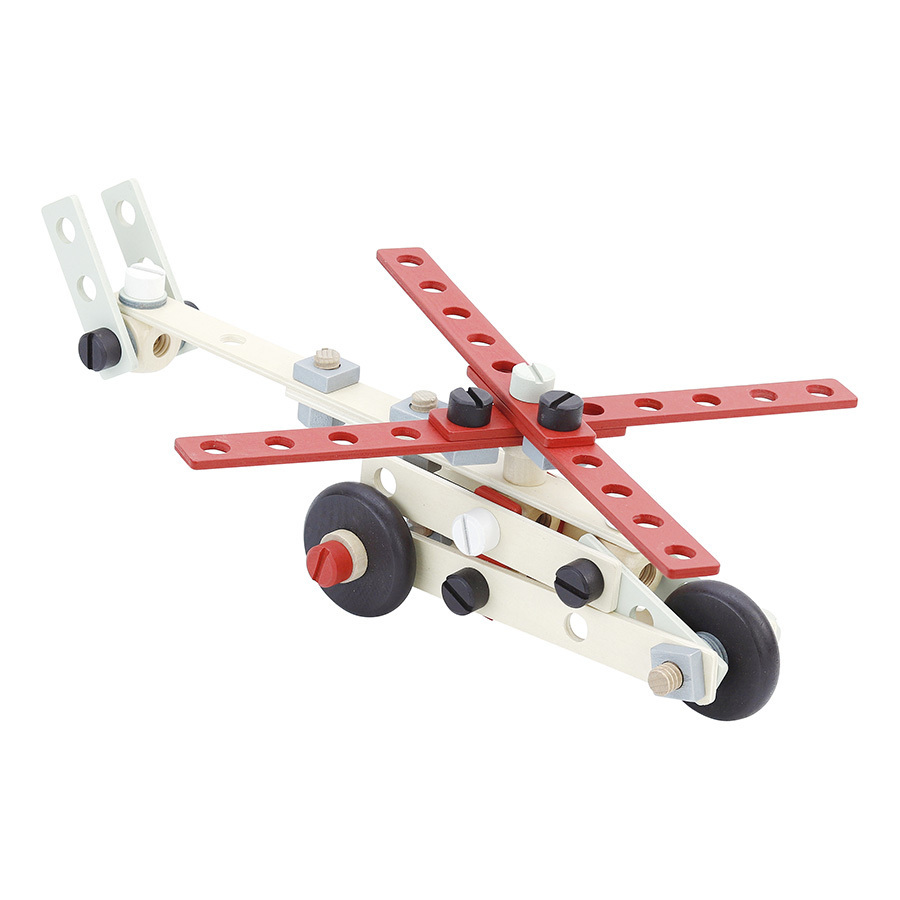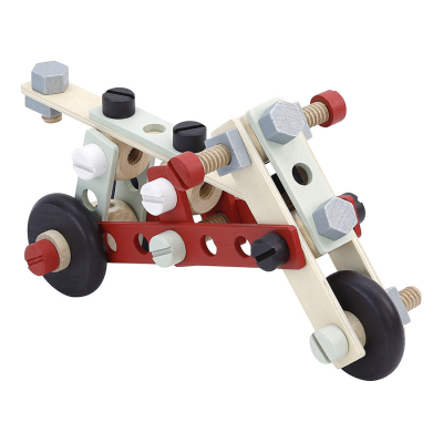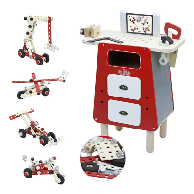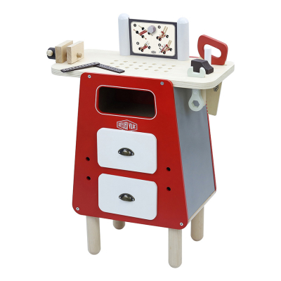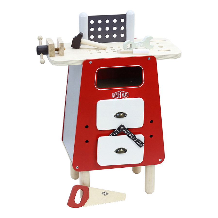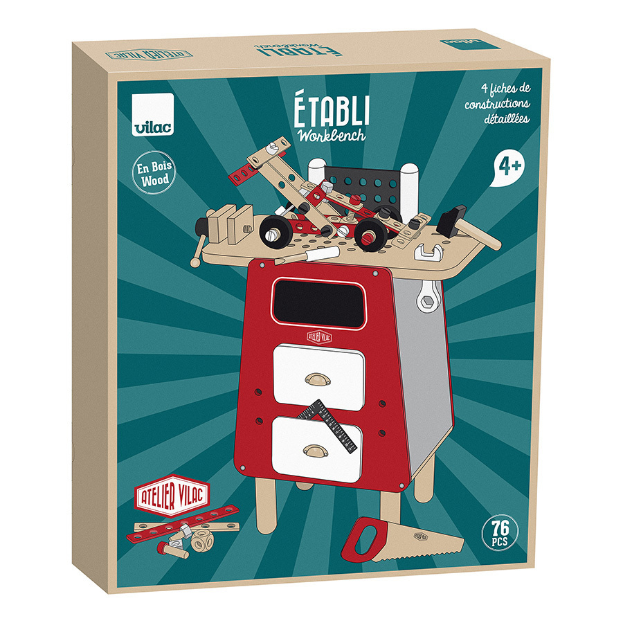 • 1 établi en bois. • De nombreux accessoires et outils en bois : marteau, scie, tournevis, clé plate, clous, écrous, boulons, planchettes percées (76 pièces au total).