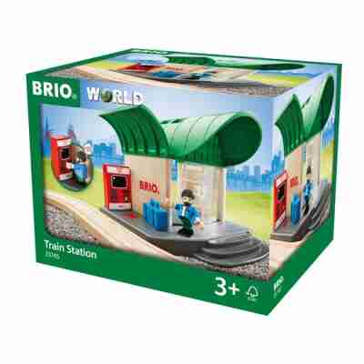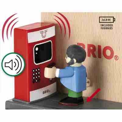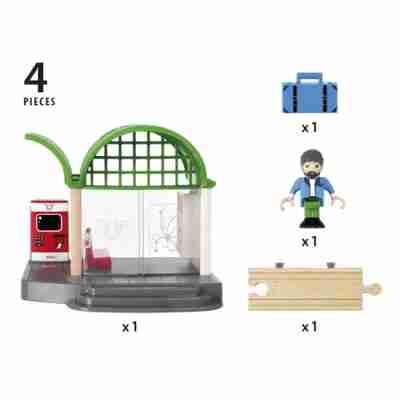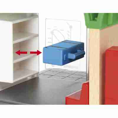 Prêt pour le départ ! Avec cette nouvelle gare, attendre un train devient agréable. Placez le personnage devant le guichet automatique pour déclencher un son d’impression de billet. En cas de mauvais temps, installez-le à l’abri derrière les portes coulissantes. Le hall est équipé de consignes à bagages, de plans et d’un confortable canapé. Jouet en bois au design moderne avec des détails en bois.
