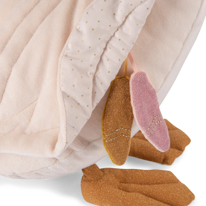 Ce grand cygne d’activités semble tout droit sorti d’un ballet imaginaire, posé là pour accompagner bébé dans ses premières explorations. Son corps généreux en velours invite aux câlins, tandis que son long cou courbé et son bec doré dessinent une silhouette apaisante et pleine de grâce. Inspiré de l’univers tendre et poétique de La petite école de danse, il trouve naturellement sa place dans la chambre ou près du tapis d’éveil.