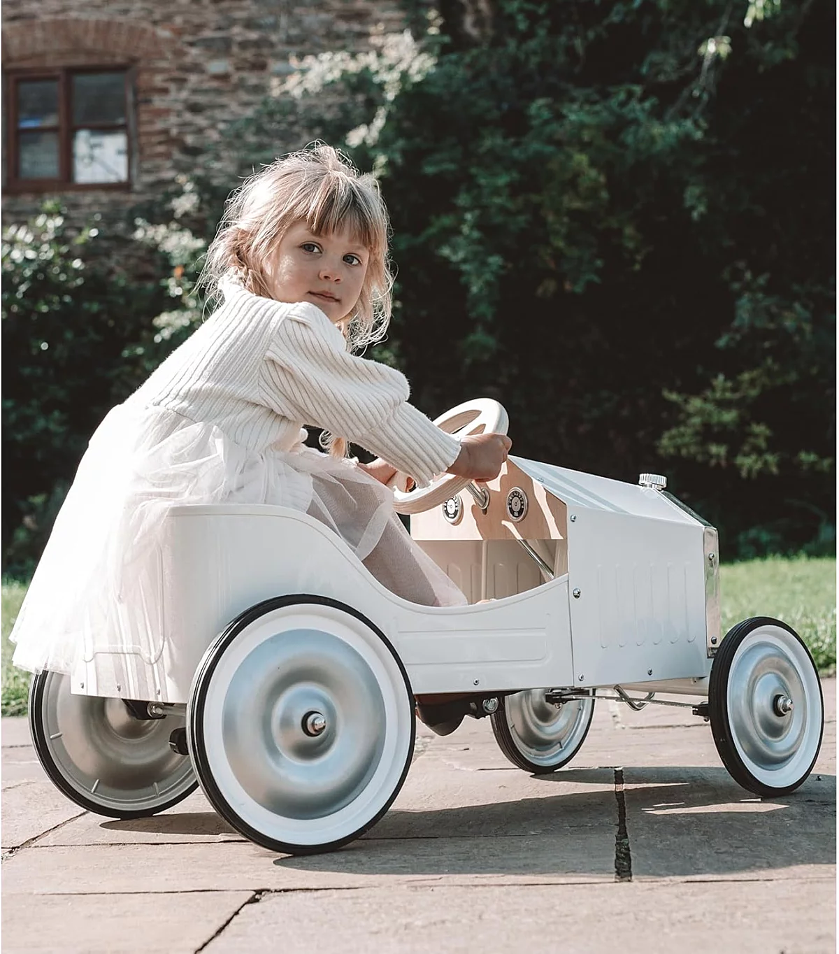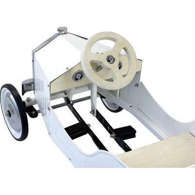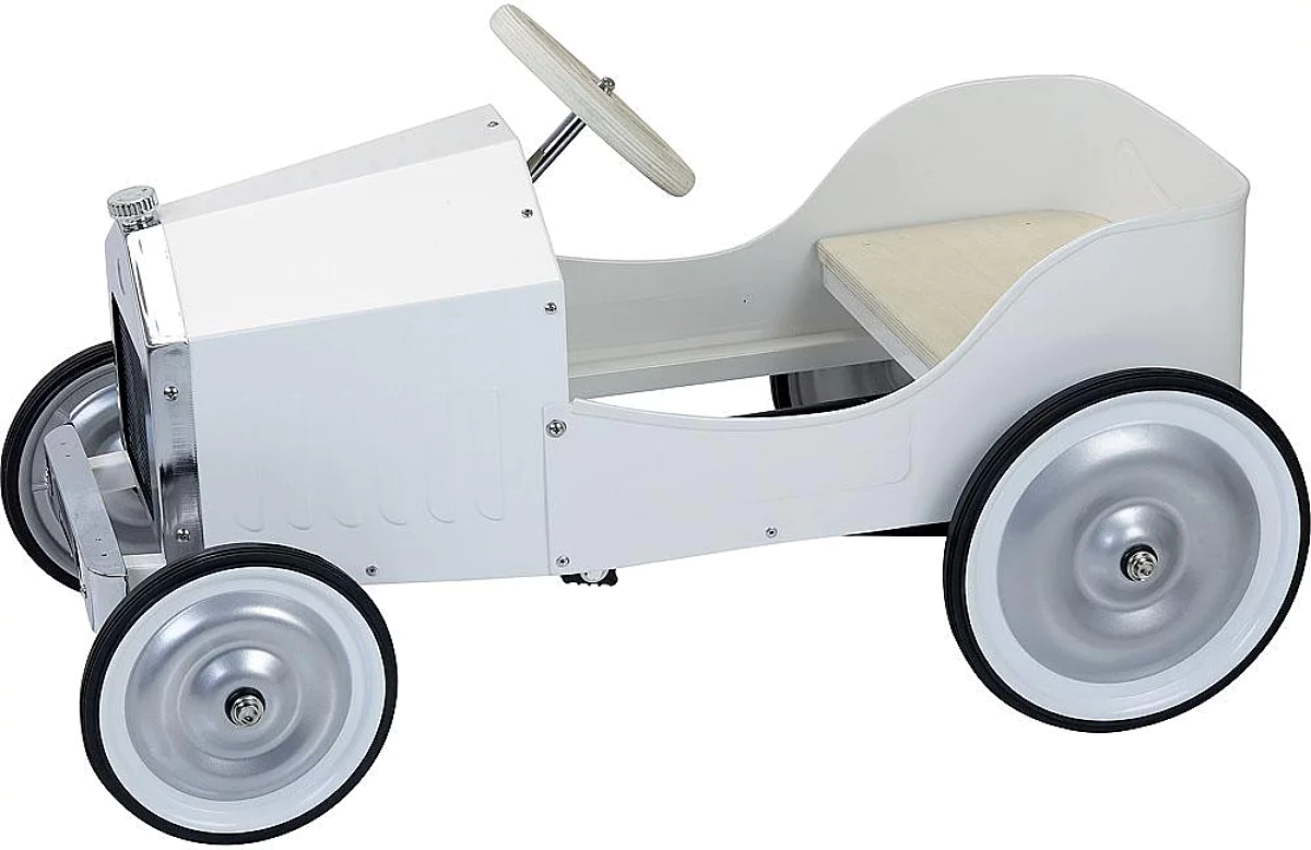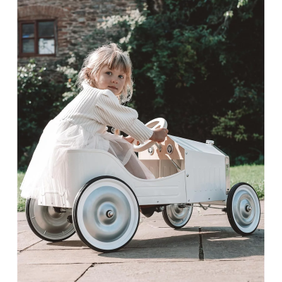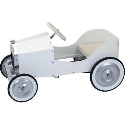 Avec son allure rétro et sa carrosserie ivoire laquée, cette grande voiture à pédales en métal fait rêver les petits pilotes en herbe. Solide et élégante, elle rappelle les bolides d’antan tout en offrant aux enfants un jouet durable et intemporel. Le volant et l’assise en bois naturel apportent une touche chaleureuse et authentique. Dès 3 ans, les enfants prennent place derrière le volant et partent à l’aventure, développant leurs capacités motrices et leur plaisir de se déplacer par eux-mêmes.