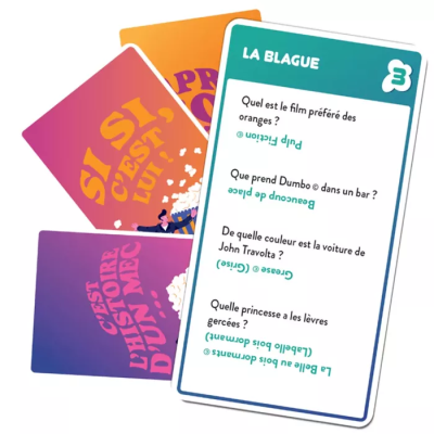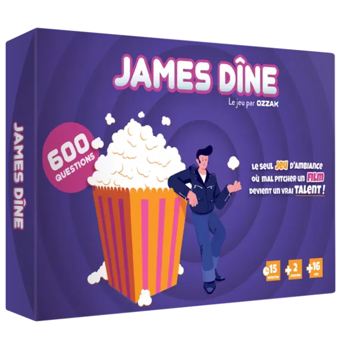 Et si le pire raconteur de films devenait la star de la soirée ? James Dîne est un jeu d’ambiance délirant qui transforme vos maladresses de cinéphile en un véritable talent ! Entre pitchs improbables, titres revisités et anecdotes loufoques, vous allez rire aux éclats en revisitant vos classiques du 7ème art. Avec ses 4 catégories de cartes et pas moins de 600 questions, préparez-vous à des soirées interminables où chaque joueur pourra révéler sa créativité… ou sa mauvaise foi légendaire. James Dîne, c’est un peu le cinéma version pop-corn et fous rires, accessible à tous, même à ceux qui confondent encore Titanic et Inception !