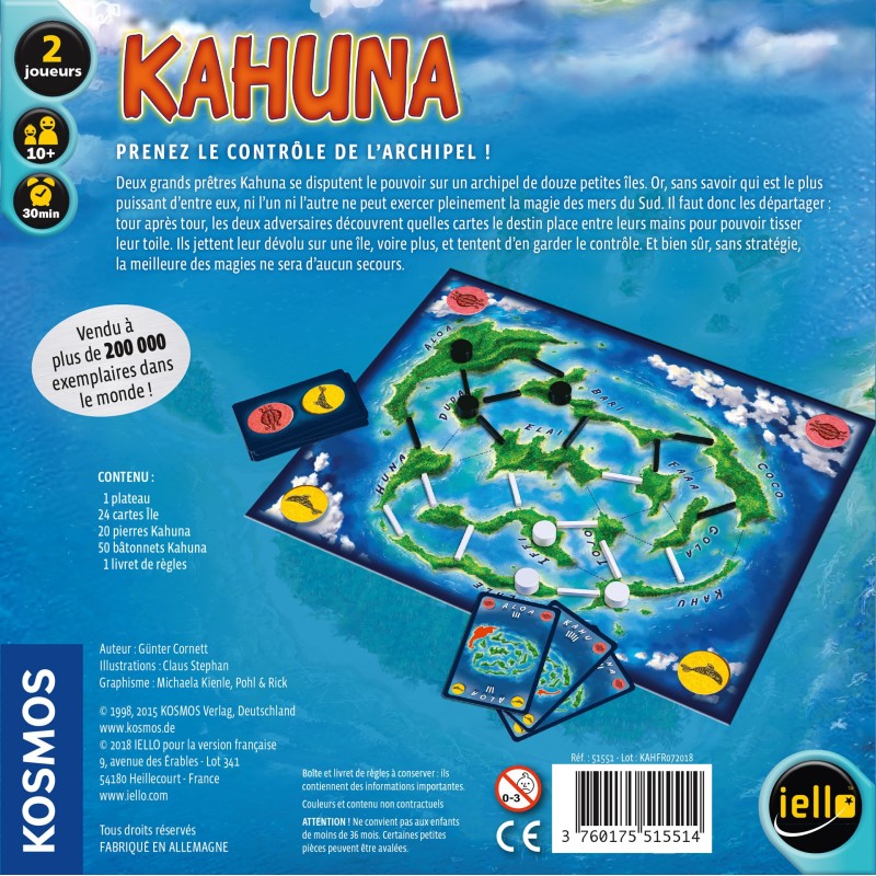 Au cœur du Pacifique, deux grands prêtres se disputent le contrôle d’un archipel mystérieux. Île après île, ils tissent des liaisons pour étendre leur influence et prouver qui maîtrise réellement la magie des Kahunas. Sur les douze îles en jeu, chaque connexion construite peut faire basculer l’équilibre du pouvoir… et arracher la victoire à l’adversaire.