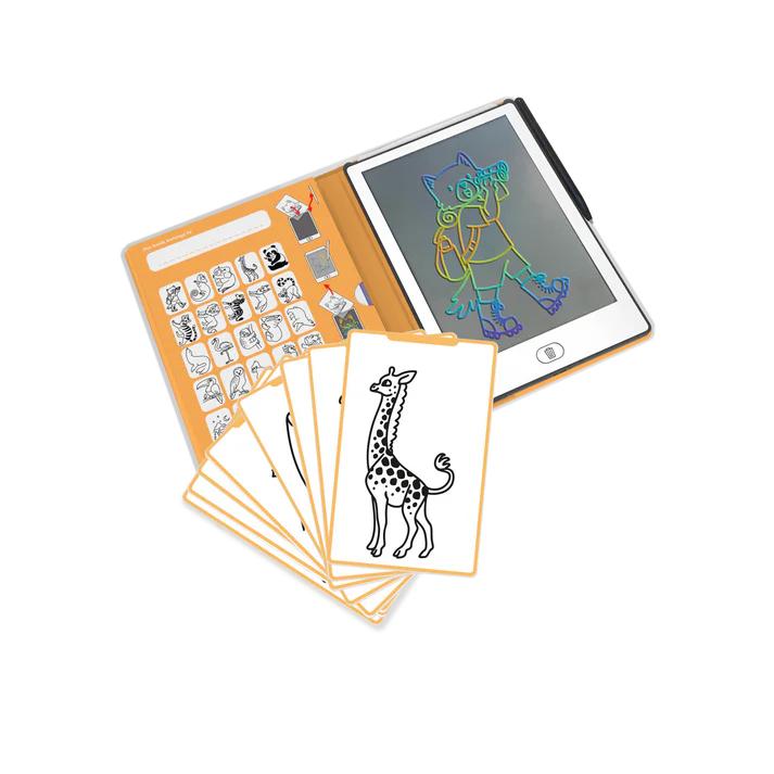 Zèbre, panda, caméléon ou éléphant… avec KIDYDRAW-MINI version Animaux, les enfants découvrent le plaisir de dessiner tout en voyageant dans le monde animal ! Ce petit livre malin cache un écran LCD de 8,2 pouces et 30 modèles à décalquer, soigneusement rangés dans une pochette. À la maison, en voiture ou en vadrouille, cette ardoise digitale suit les petits artistes partout.