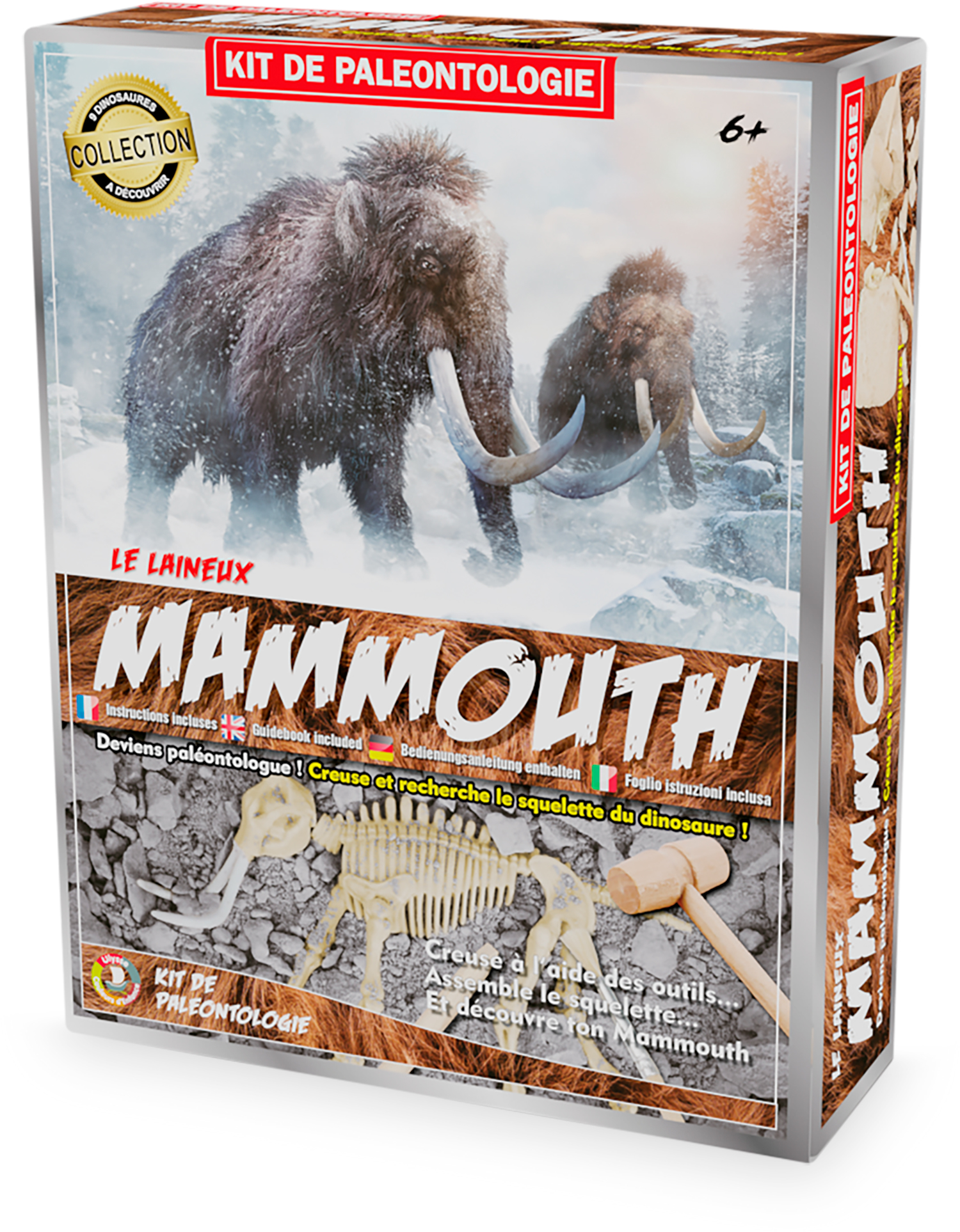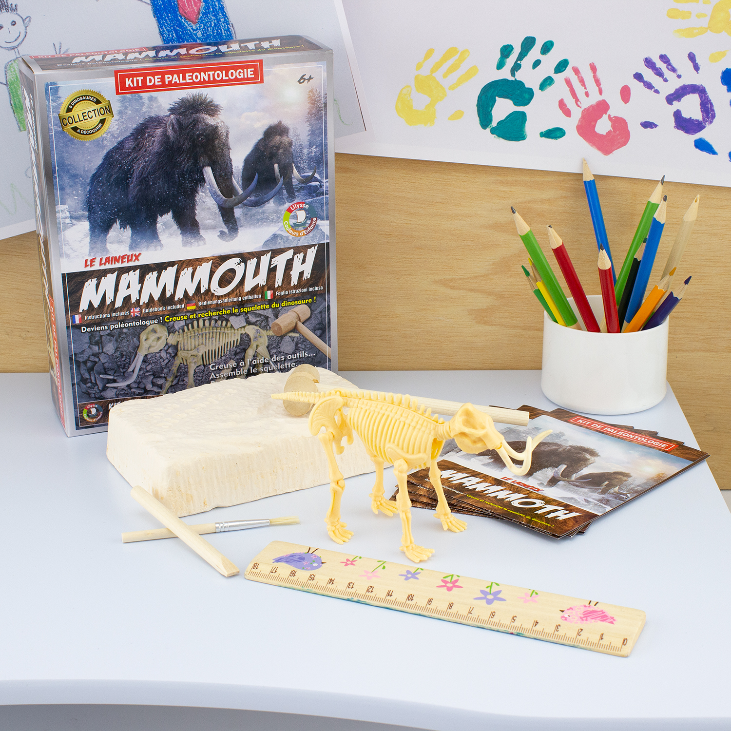 Voyage dans les steppes glacées de la préhistoire et pars à la rencontre du géant laineux : le Mammouth ! Grâce à ton kit de paléontologue, arme-toi de ton marteau et de ta brosse pour déterrer patiemment son squelette dissimulé dans le bloc. Pièce après pièce, assemble cette impressionnante créature aux longues défenses recourbées, symbole de la dernière ère glaciaire. Ce kit éducatif permet aux enfants de découvrir le travail des chercheurs de fossiles tout en s’amusant. Une fois reconstitué, ton Mammouth trônera fièrement comme un véritable fossile prêt à raconter son histoire.