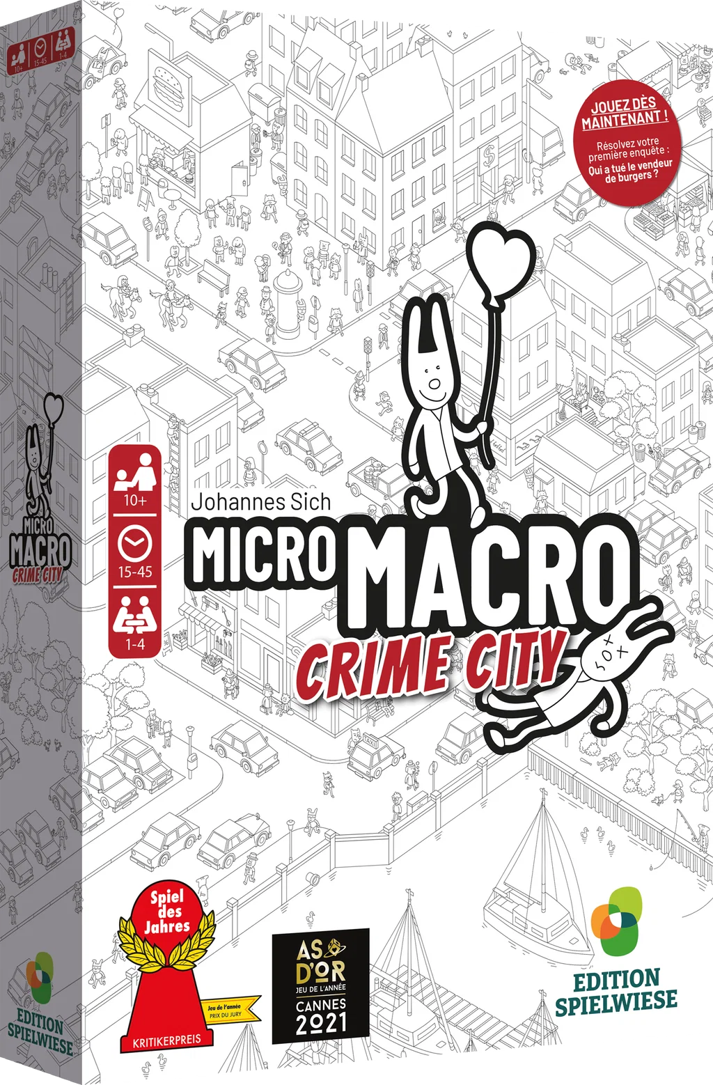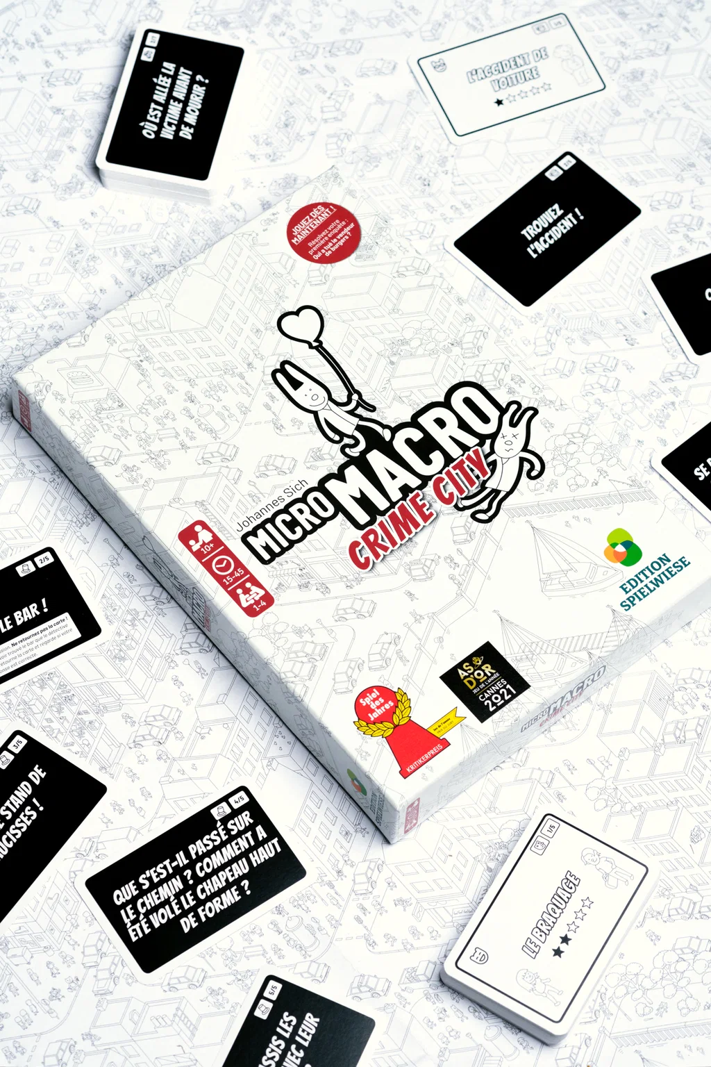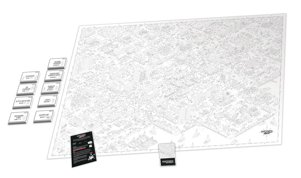 Micro Macro Crime City est un jeu de société coopératif d’observation et de déduction édité par Edition Spielwiese et distribué par Blackrock Games. Le jeu propose aux joueurs d’explorer une immense carte de ville en noir et blanc, remplie de personnages, de rues, de bâtiments et de scènes minuscules à examiner avec attention. L’objectif est de résoudre plusieurs affaires criminelles en retrouvant des indices visuels disséminés sur le plan. Le matériel comprend un grand plan de la ville, 120 cartes enquête, 16 enveloppes et une loupe. L’ensemble offre une expérience originale, immédiatement reconnaissable, qui transforme la partie en véritable enquête visuelle à partager autour de la table.