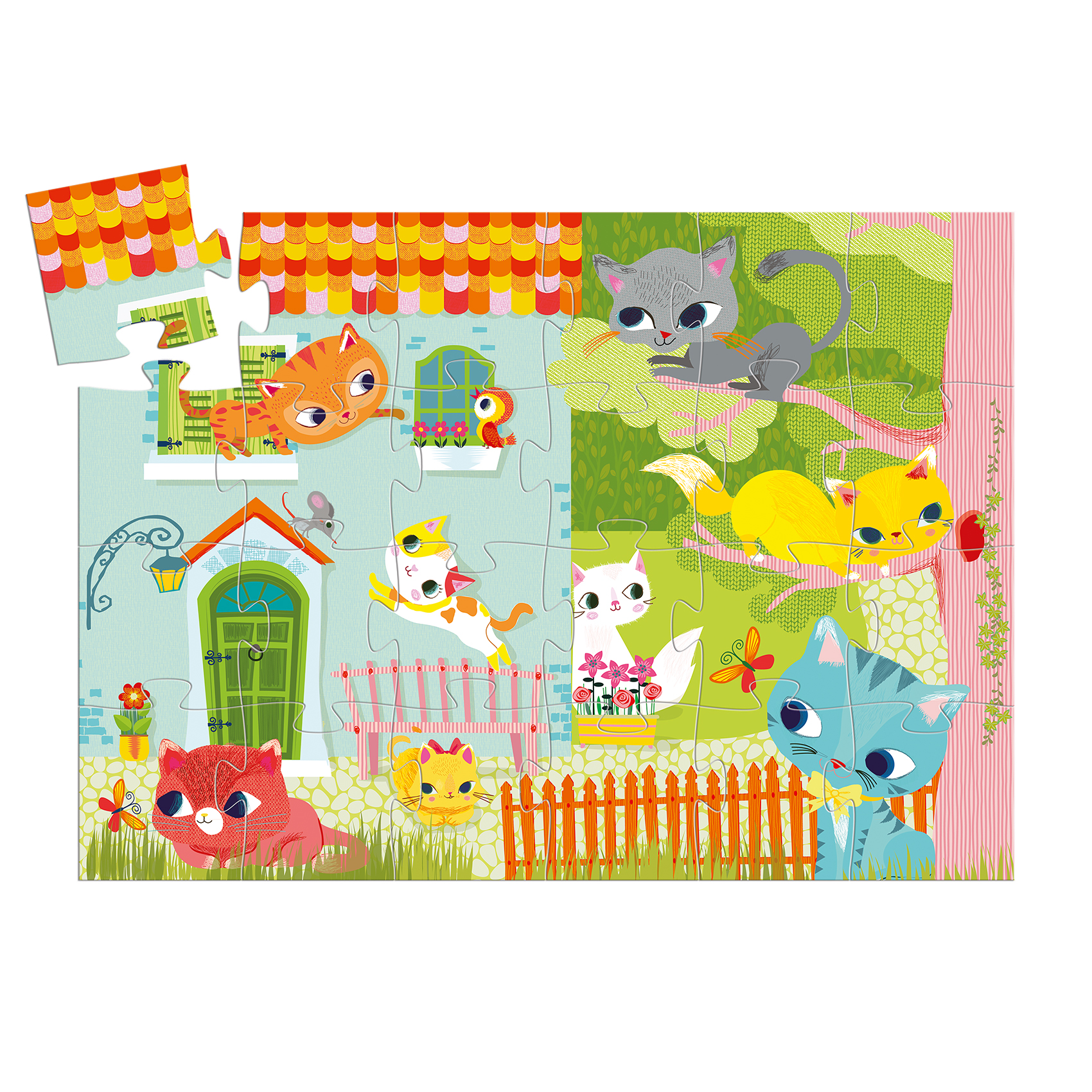Pachat a invité ses amis à jouer à la maison. Un magnifique puzzle de 24 pièces dans une boîte élégante en forme de chat.