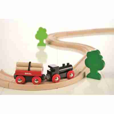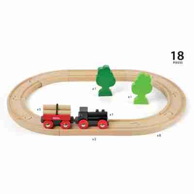 Départ imminent du train vers la forêt ! Poussez la locomotive sur les rails et transportez les troncs d’arbre chargés sur le wagon. Un circuit 100% bois pour les amoureux de nature ! Livré avec une locomotive manuelle, un wagon de chargement avec 3 troncs d’arbre amovibles, 2 arbres et 10 rails en bois de hêtre à connecter.