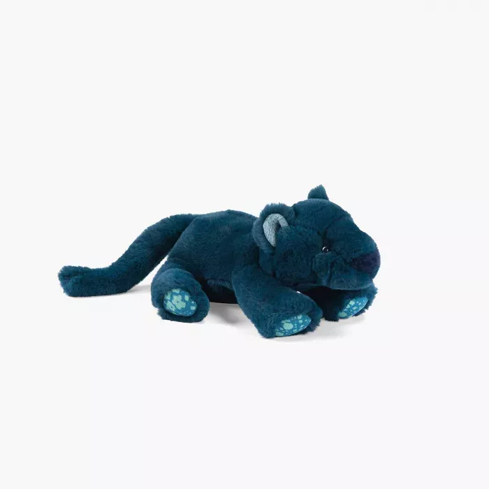 Cette petite panthère de la collection Tout autour du monde charme par son allure douce et veloutée. Son pelage d’un bleu profond évoque la nuit calme des forêts lointaines, tandis que ses oreilles subtilement pailletées captent la lumière comme des éclats d’étoiles. Allongée dans une posture souple, elle semble guetter un câlin plutôt qu’une proie, offrant sa tendresse à tous ceux qui croisent son regard. Ses coussinets décorés d’un joli jacquard apportent une touche raffinée, et sa longue queue s’enroule naturellement contre l’enfant lors des moments de réconfort. Légère, douce et idéale pour accompagner les histoires de jungle, cette panthère devient rapidement un compagnon rassurant et poétique, parfait pour les jeux imaginaires comme pour les instants apaisants.