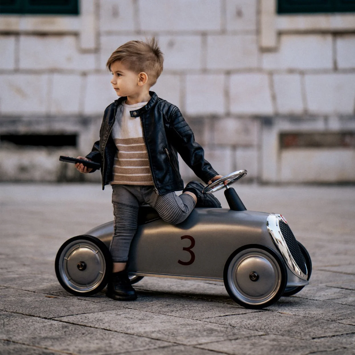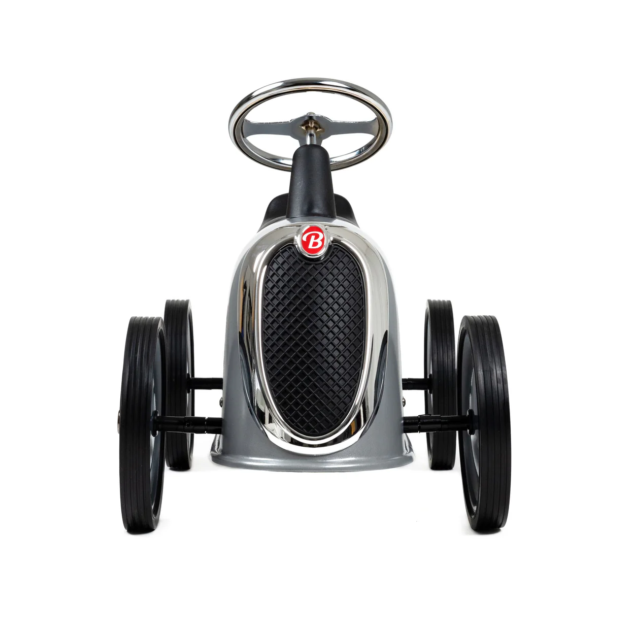 Avec sa silhouette élancée et sa teinte gris silver, ce porteur Rider de Baghera évoque les voitures de course d’autrefois, celles qui filaient sur les routes avec panache et précision. Sa carrosserie en métal lisse, rehaussée d’une large calandre chromée, lui confère une allure affirmée et rassurante. Le volant en métal invite naturellement les petites mains à diriger la trajectoire, tandis que la selle noire assure une assise confortable pour les longues escapades. Conçu pour être chevauché dès les premières années, ce porteur accompagne l’enfant dans la découverte du mouvement, du contrôle et de l’espace, transformant chaque couloir, chaque terrasse ou chaque allée en terrain de jeu grandeur nature.