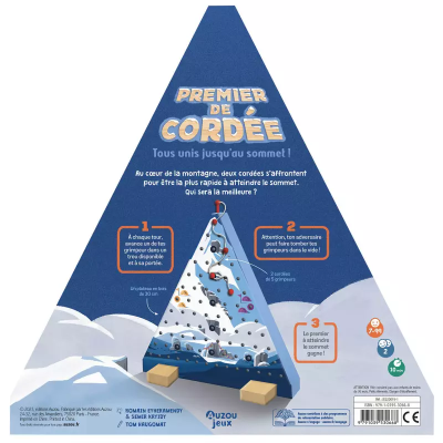 À chaque tour, les joueurs déplacent un grimpeur vers un trou disponible… mais attention, l’adversaire peut faire tomber un membre de l’équipe et si deux membres tombent, c’est perdu. Un camp de base !! Profitez-en pour vous ravitailler, mais chacun son camp ! Dans Premier de cordée, il faudra donc avancer prudemment, rester soudés et faire preuve d’un vrai esprit d’équipe pour gagner la course vers les cimes.
