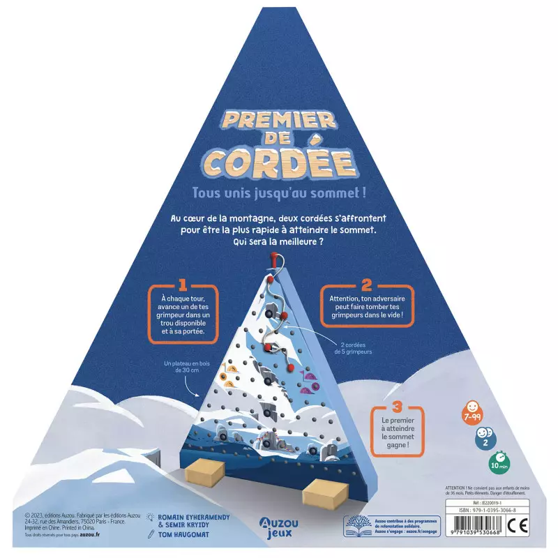 Dans cette course en altitude, chaque grimpeur fait partie d’une cordée déterminée à atteindre le sommet avant l’autre… mais sans jamais lâcher ses coéquipiers ! Un plateau en bois en forme de montagne, des trous de prise à atteindre, et un brin de stratégie suffisent pour transformer cette ascension en une aventure palpitante.