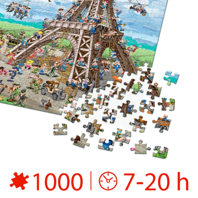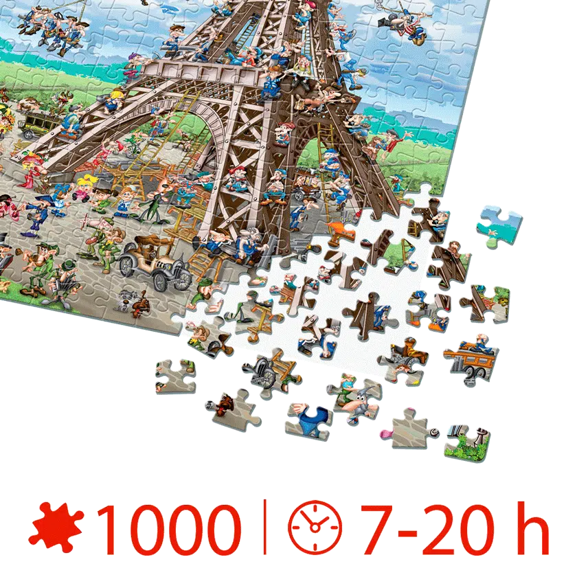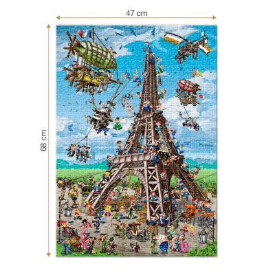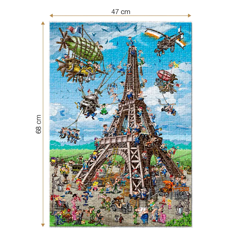 Un vent de folie souffle sur la Dame de Fer ! Dans ce puzzle haut en couleur de 1000 pièces, la Tour Eiffel prend vie sous un déluge de scènes burlesques et de personnages volants. Dirigeables, hélicoptères bricolés et ouvriers acrobates s’activent tout autour de la structure iconique dans une ambiance déjantée. Comme toujours dans la collection Cartoon de D-Toys, les détails humoristiques abondent et chaque petit coin du puzzle réserve son lot de surprises. À mi-chemin entre construction délirante et aventure aérienne, ce puzzle est une invitation à assembler dans la bonne humeur !