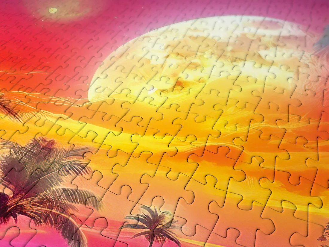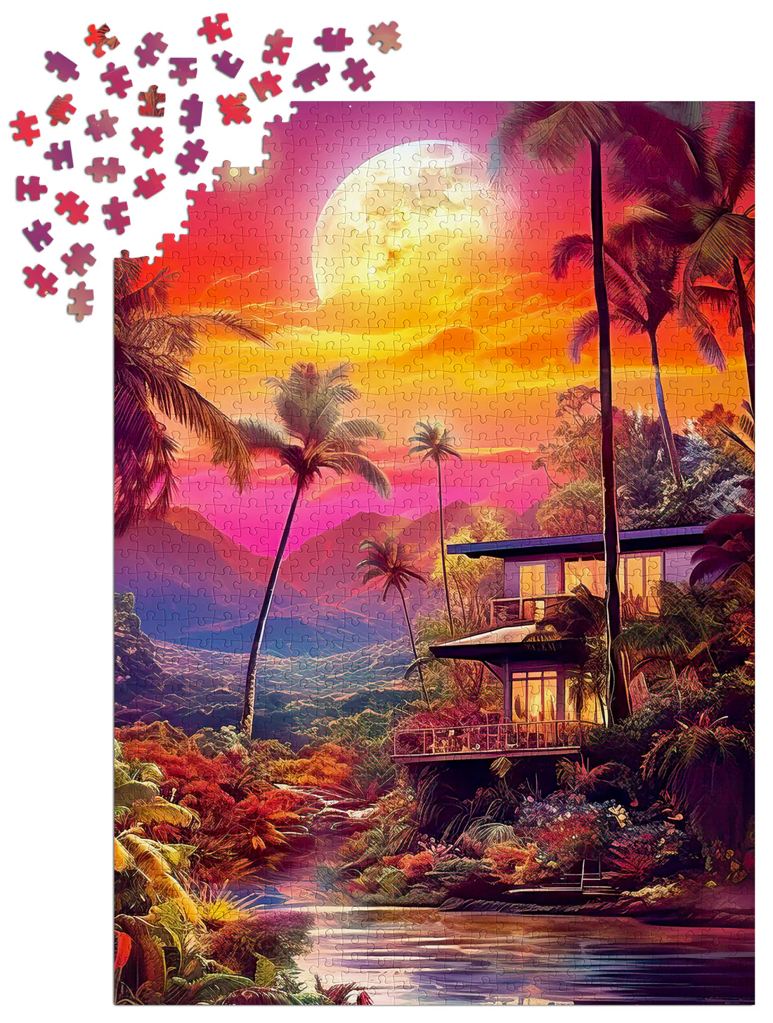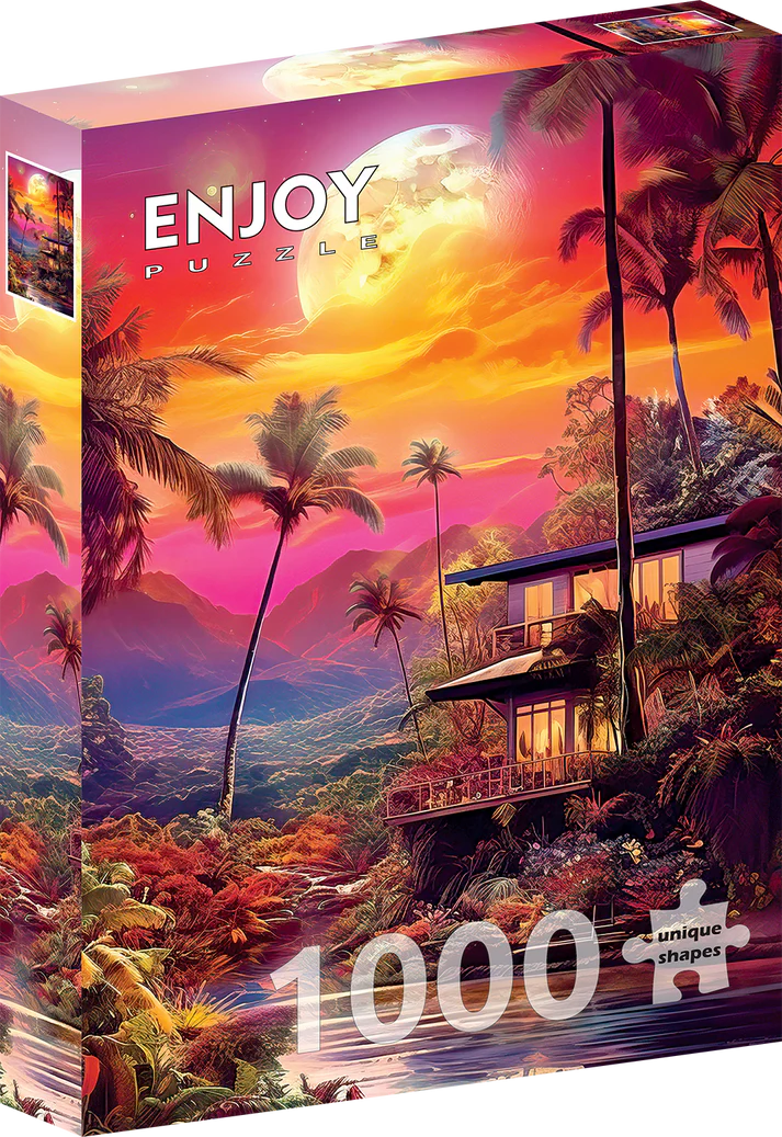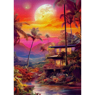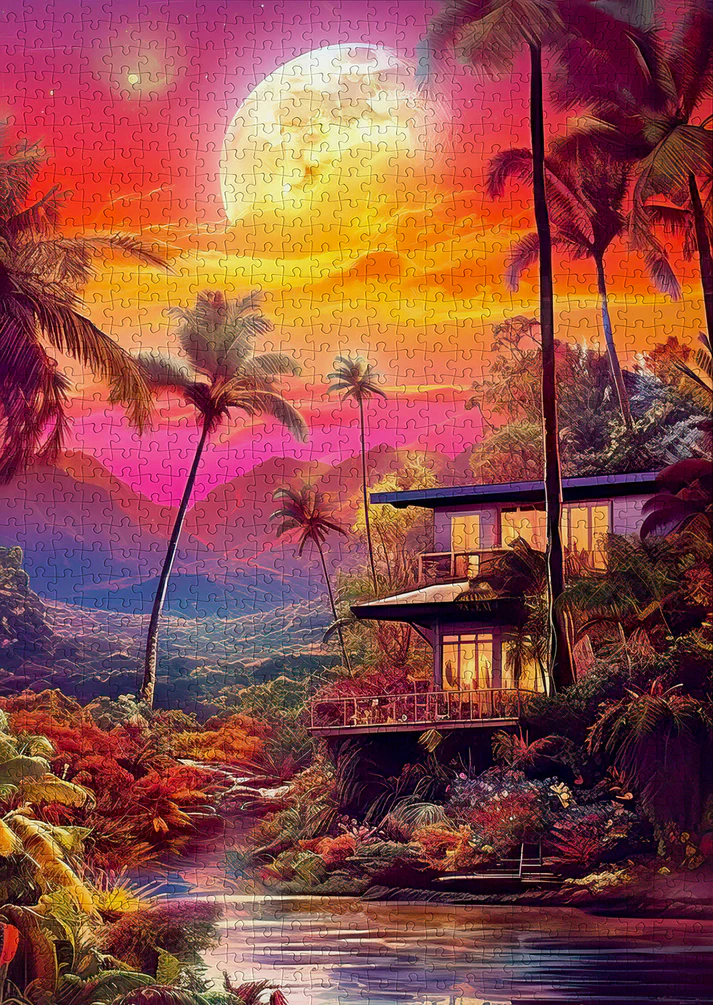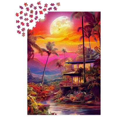 Un crépuscule flamboyant s’étend sur un paysage tropical : palmiers élancés, montagnes embrumées et lune dorée qui éclaire une maison moderne nichée dans la nature. L’instant est suspendu, baigné de nuances de rose, d’orange et de violet qui font vibrer chaque pièce du puzzle.