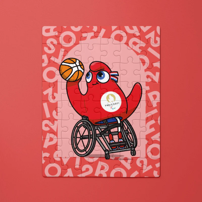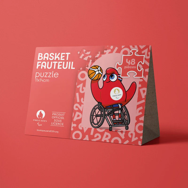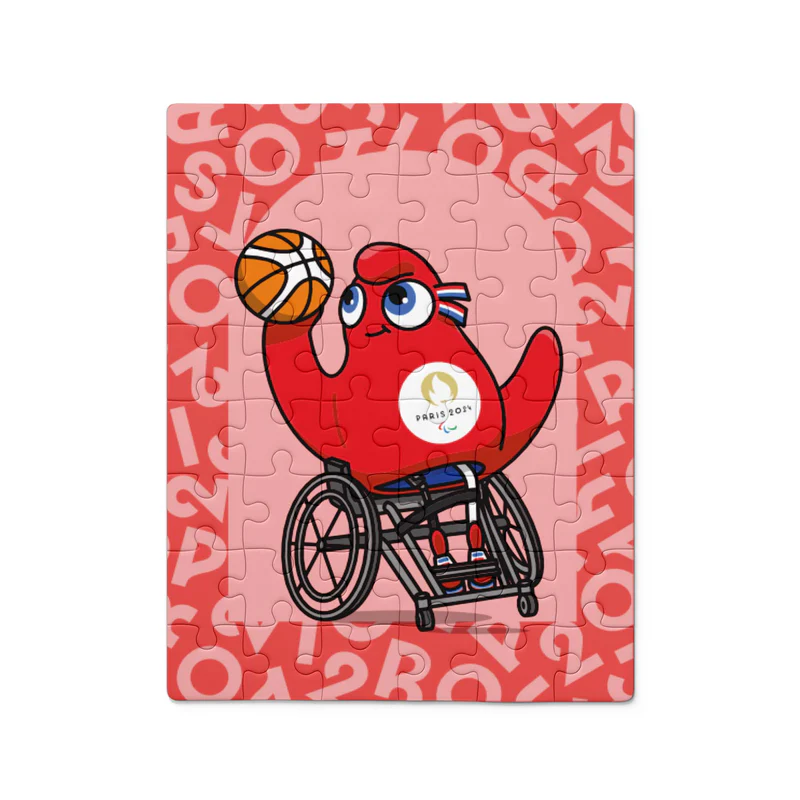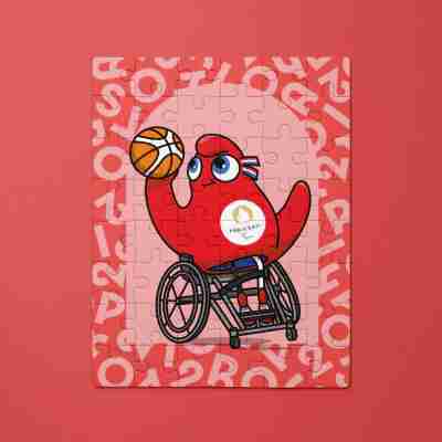Petit puzzle de 48 pièces pour enfant représentant une phryge, la mascotte des Jeux de Paris 2024 en train de jouer au basket fauteuil.