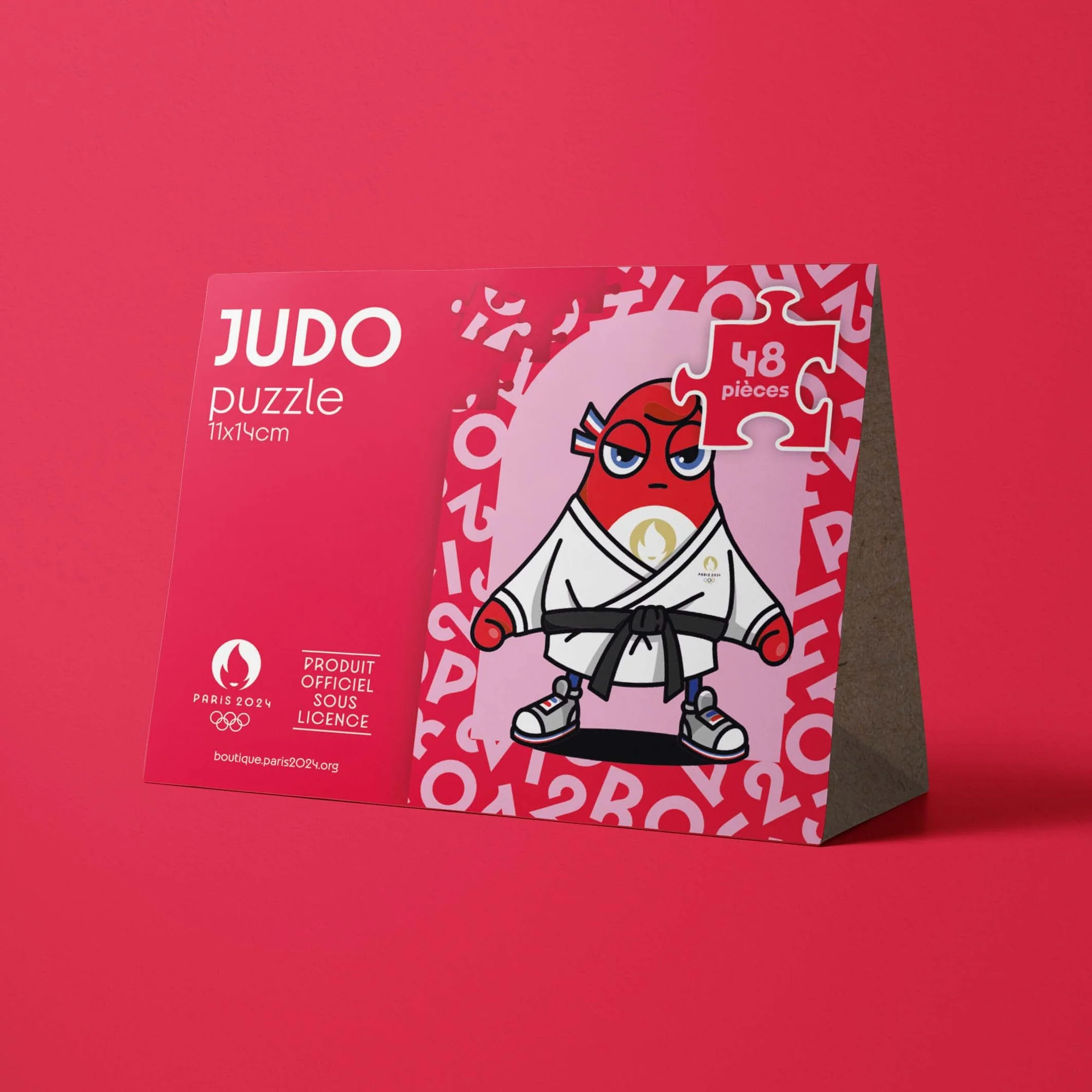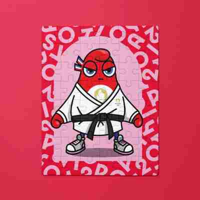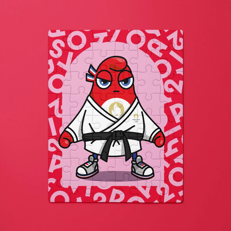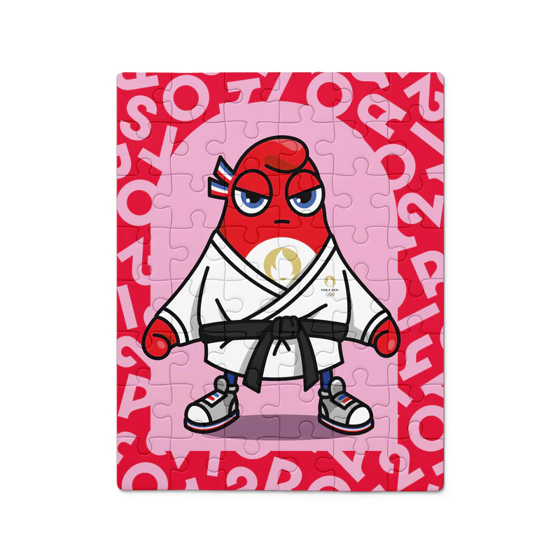 Petit puzzle de 48 pièces pour enfant représentant une phryge, la mascotte des Jeux de Paris 2024 en tenue de judo.