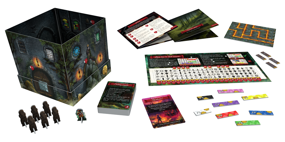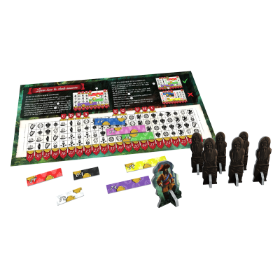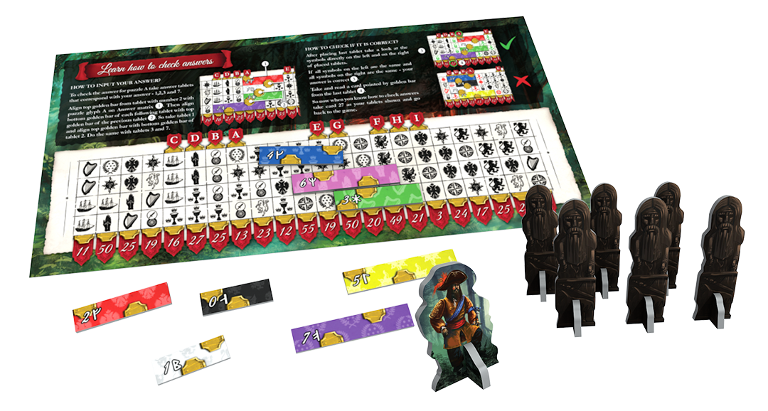 | Contenu | 47 cartes 1 grille de réponse 8 jetons Réponse 1 fiche d’Indices 1 pion Héros 4 jetons Puzzle du coffre 6 pions Totem 3 éléments de décor 3D 1 plateau recto verso |