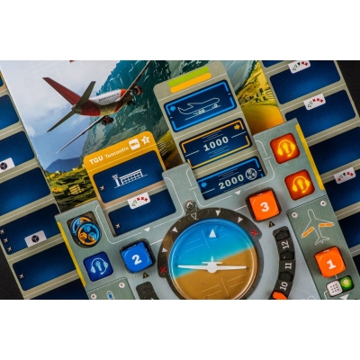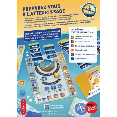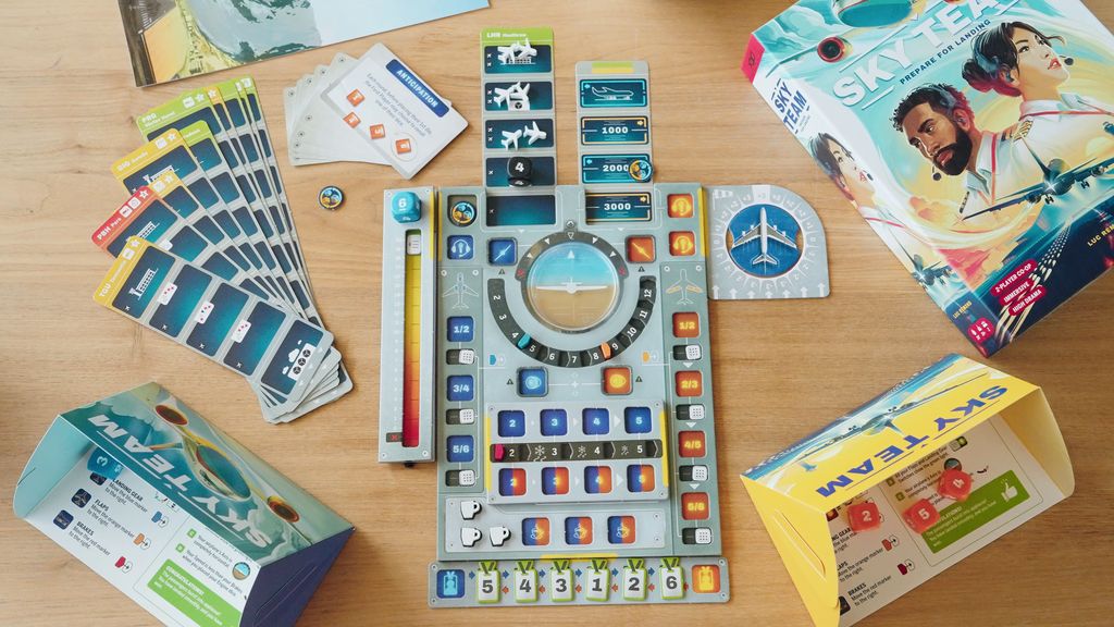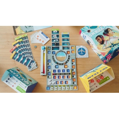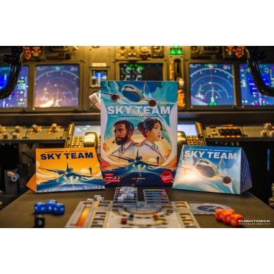 Sky Team est un jeu de société coopératif pour deux joueurs édité par Le Scorpion Masqué. Dans ce jeu immersif, les joueurs incarnent un pilote et un copilote chargés de faire atterrir un avion de ligne dans différentes conditions. Le jeu repose sur une mécanique originale de placement de dés cachés et de coordination indirecte. Chaque joueur lance ses dés en secret puis les place sur un tableau de bord représentant les systèmes de l’avion. Il faudra gérer la vitesse, l’axe, les volets, les trains d’atterrissage, la communication avec la tour de contrôle et les freins pour réussir l’atterrissage.