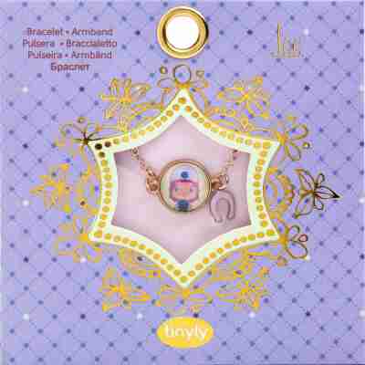 Un bracelet composé d’un médaillon représentant la cavalière Tinyly « Joe » sur une chaîne en métal doré agrémentée d’un charms coloré en forme de fer à cheval.