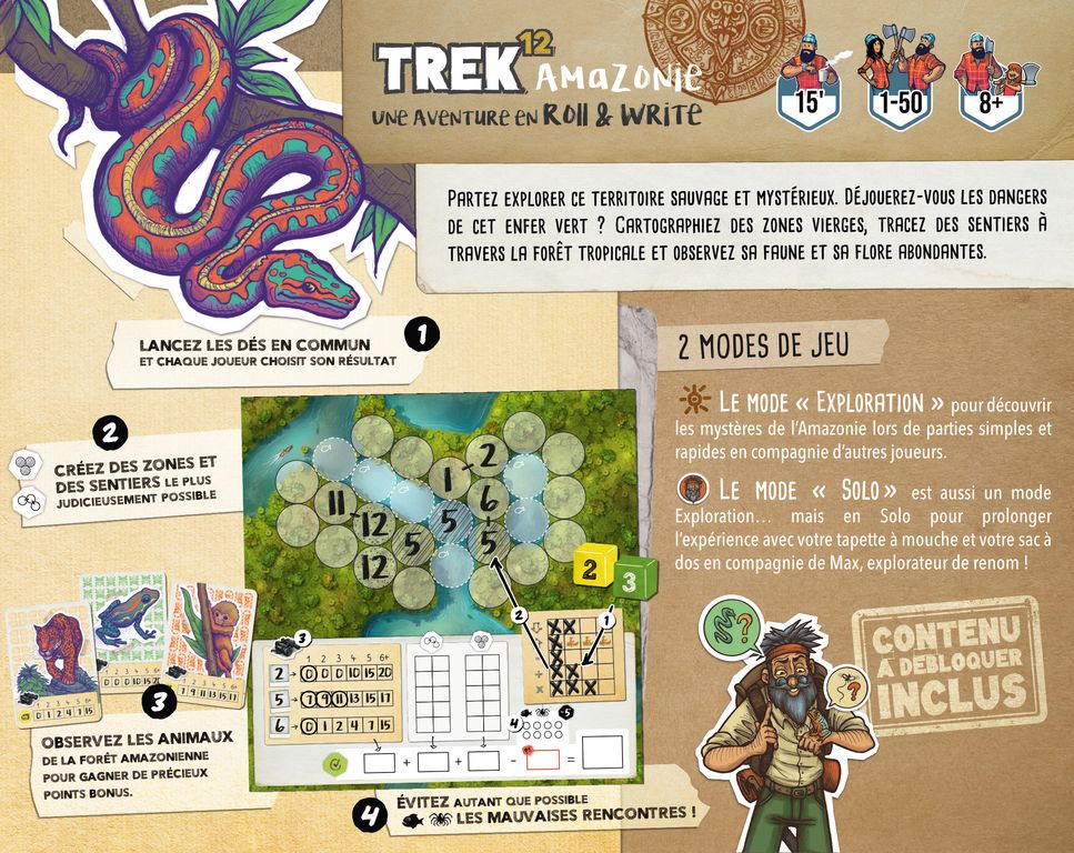 Après les sommets glacés, place à la moiteur de la jungle avec Trek 12 Amazonie ! Ce Roll & Write indépendant vous entraîne dans les profondeurs de la forêt tropicale. Cartographiez des zones vierges, ouvrez des sentiers au milieu d’une végétation luxuriante et observez la faune colorée. Mais prenez garde aux mauvaises rencontres qui pourraient compromettre votre exploration… Grâce à ses 2 modes de jeu – Exploration à plusieurs ou Solo aux côtés de Max l’explorateur – chaque partie devient un voyage inédit au cœur d’une nature sauvage et mystérieuse.