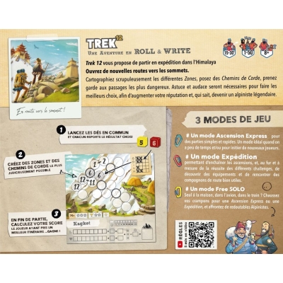 Partez à l’assaut des cimes les plus hautes avec Trek 12 Himalaya, un jeu de société Roll & Write évolutif qui vous emmène en expédition dans les montagnes mythiques. Lancez les dés, cartographiez vos itinéraires, tracez des chemins de corde et franchissez les passages les plus périlleux pour tenter de devenir un alpiniste légendaire.