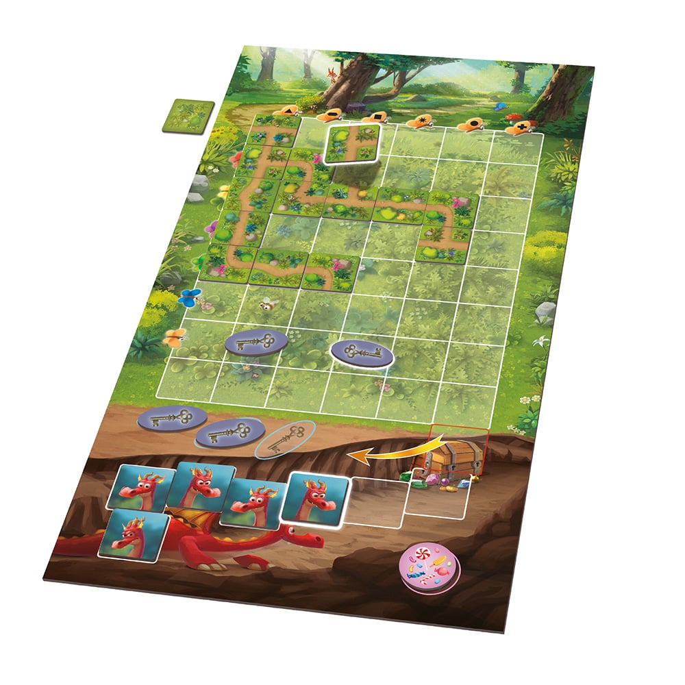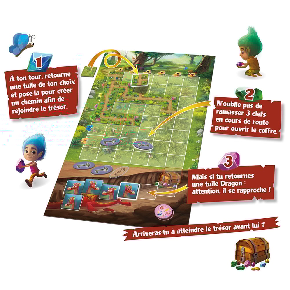 Dans le cœur d’une forêt enchantée, de courageux petits lutins tracent leur chemin, tuile après tuile, à travers ronces et clairières. Ensemble, ils doivent retrouver les trois clés magiques disséminées dans les bois afin d’ouvrir le fabuleux coffre aux trésors. Mais gare ! Le dragon, tout écaille et panache, n’est jamais bien loin… Il rentre au bercail, et s’il vous rattrape, adieu joyaux et pierres étincelantes !